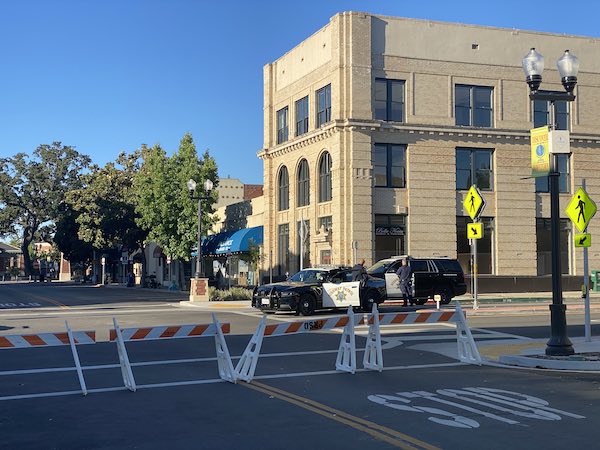 Law enforcement has shut down Spring Street around Downtown and barricades have been set up from 9th and Spring to 13th and Spring and east to Riverside Ave. More than a dozen police, sheriff’s and CHP vehicles have the streets blocked off. Law enforcement has set up a command post at the Mid-State Fair grounds, as a CHP helicopter and fixed-wing aircraft circle overhead.
