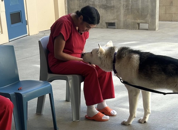 The visits included Kisseo, a 2-year-old Husky and German Shepherd mix, and Dahlia, a 2-year-old Pit Bull Terrier mix. The dogs visited incarcerated individuals and staff.