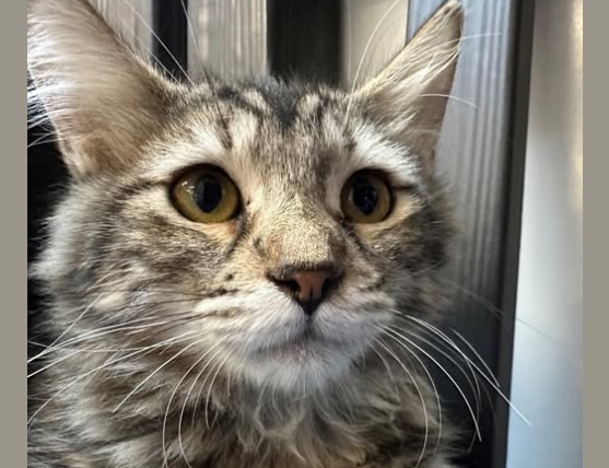 She is described as a small, fluffy kitten with a quiet voice and a gentle, affectionate nature. Lorraine may be shy when first meeting new people, but with patience and calm attention she will warm up, curl beside her person and follow them closely. She enjoys ear scratches, warm blankets and soft voices.