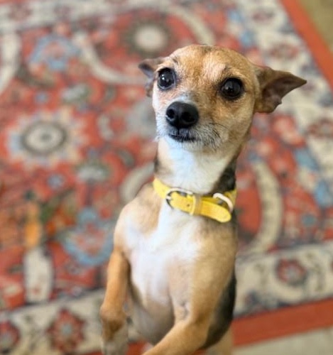 Waffles is an 8-pound chihuahua mix believed to be about four years old