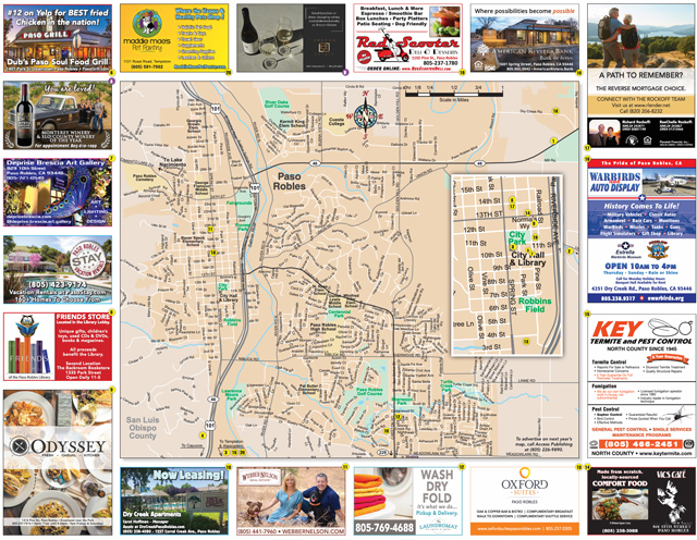 Access Publishing is preparing its annual Paso Robles Area Map for publication and there are advertising spaces available for local businesses. “Last year’s maps are all gone so now is your chance to be included in the new one,” says publisher Scott Brennan.