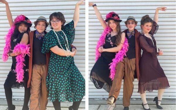 Left: Lilly St. Regis, Rooster, Miss Hannigan (Wanda Kennard, Gabe Konopa, Kiara Barnes). Right: Lilly St. Regis, Rooster, Miss Hannigan ( Lilly Denton, Journey Minikin, Zoey Torres).