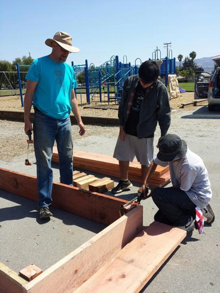 A member of Big Creek Lumber supply helps schoolchildren construct a redwood bed for the school garden.