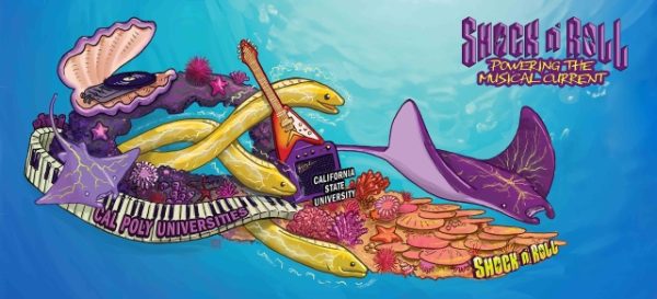 The colorful float will feature a pair of giant manta rays swing and a trio of electric eels powering a rock ‘n‘ roll party on the ocean floor. Float rendering courtesy of Cal Poly.