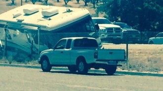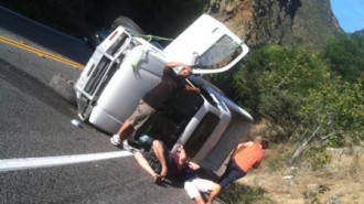 Truck slips on gravel, tips over on Highway 41