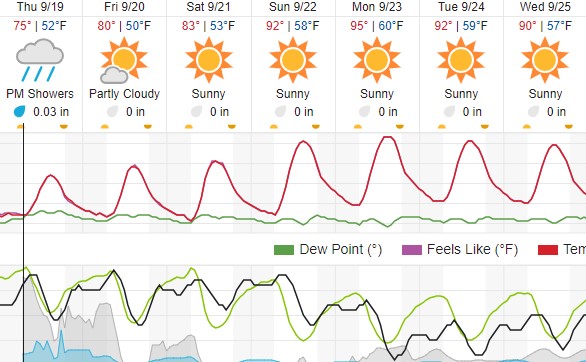 A warming trend is in the forecast for Paso Robles after cool temperatures today. Today’s forecasted high temperature is 75. Friday’s forecast is 80, Saturday’s is 83, and by Sunday, temperatures should climb into the low 90s.