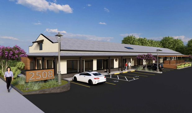 The project site is located in the Uptown Neighborhood as defined by the Uptown/Town Centre Specific Plan. Planned exterior work includes painting the building matte black, adding stained wood accents to the front elevation, installing three outdoor seating areas, and adding landscaping.
