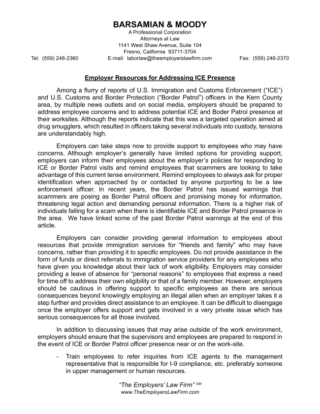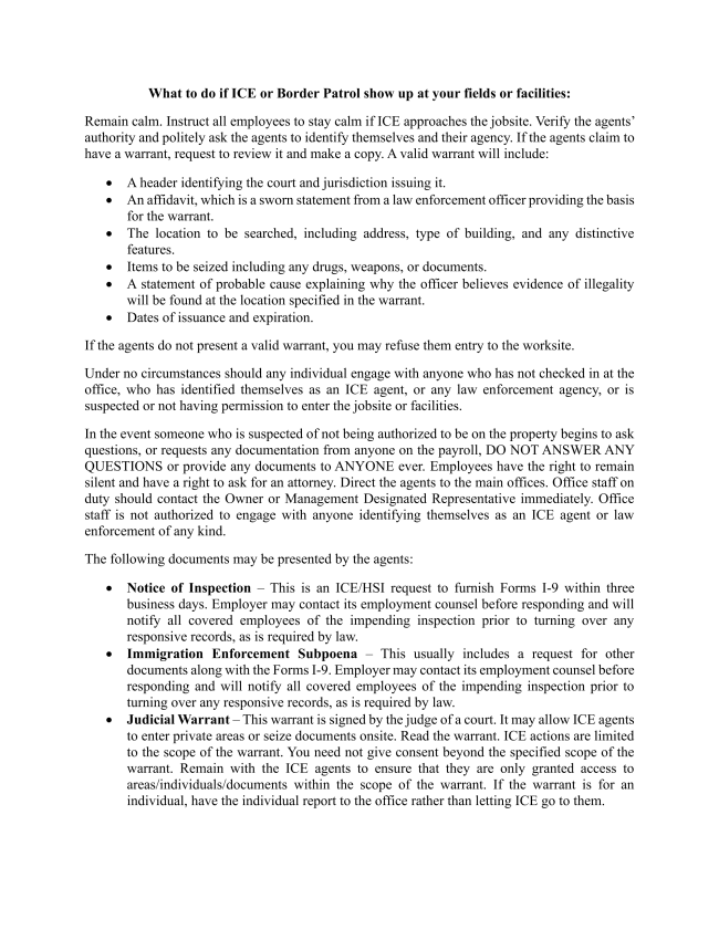 Two documents were included with the notice. Provided by Patrick Moody, an attorney with The Employers’ Law Firm in Fresno, the first document outlines steps employers and employees should take if immigration or border patrol agents arrive at agricultural fields or facilities.