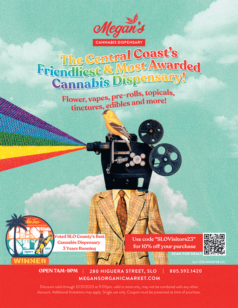 Megan’s Organic Market is SLO’s #1 adult-use cannabis retail shop. They carry the widest selection of high quality products in the county, from customer-favorites to unique and hard-to-find gems. Check out their shop today! 280 S. Higuera St., SLO, megansorganicmarket.com, (805) 592-1420