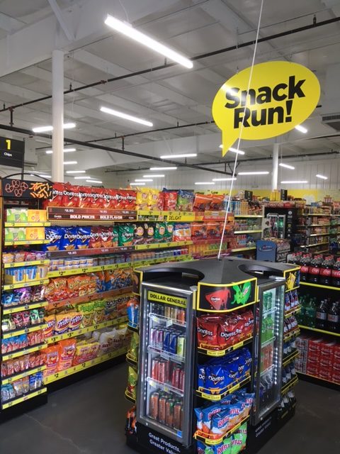 Dollar General offers food, beverages, household goods, clothing, pinatas, and automobile products. It’s like an “old school” general store, but in a brand new building.