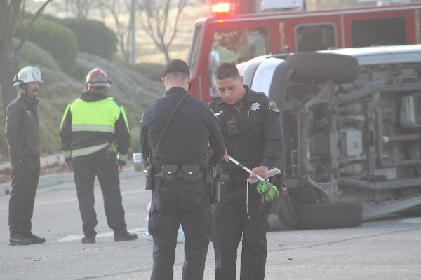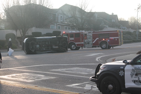 Occupants of the overturned vehicle were able to exit the vehicle without injuries