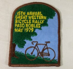 The Great Western Bicycle Rally has taken place since 1965 and is held over Memorial Day weekend. This patch is from the 1979 event. Past routes had bikers ride through Paso Robles, Templeton, Creston, Cambria, and San Simeon for around 104 miles.