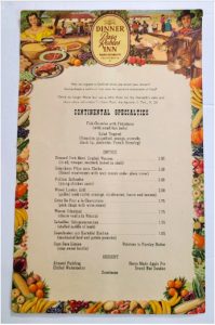 This dinner menu from the Paso Robles Inn dates from the 1960s, which is about two decades after the historic fire that burned down a majority of the hotel. The inn was built in 1889 and has hosted guests such as President Theodore Roosevelt and Clark Gable.