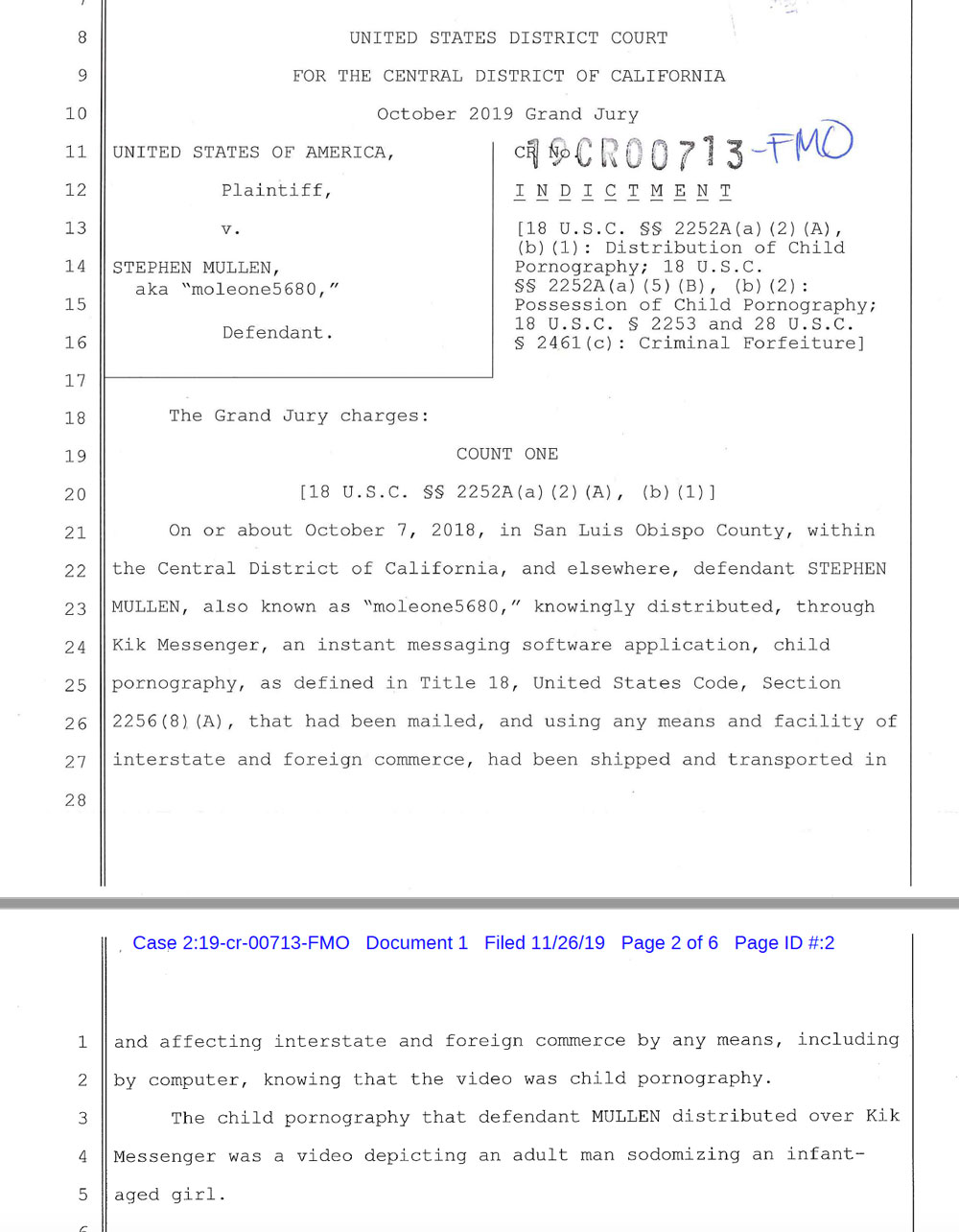 On or about October 7, 2018, in San Luis Obispo County, defendant STEPHEN MULLEN, also known as “moleone5680,” knowingly distributed, through Kik Messenger, an instant messaging software application, child pornography, as defined in U.S. Code. The child pornography that the defendant MULLEN distributed over Kik Messenger was a video depicting an adult man with an infant-aged girl.