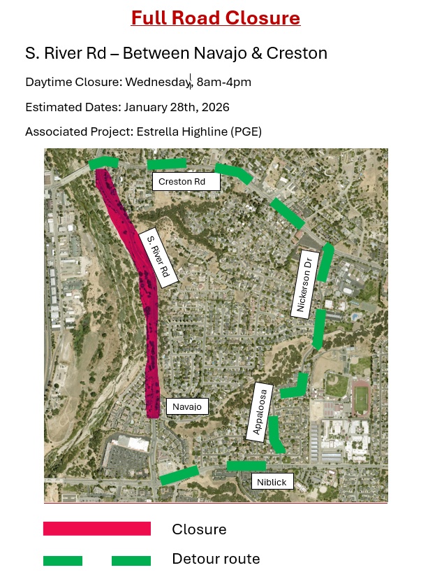 – A full road closure is scheduled on S. River Rd between Navajo and Creston on Wednesday next week, according to an announcement from the City of Paso Robles.