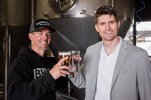 Jason Carvalho President & CEO of BarrelHouse Brewing and Dr. David Stuckenberg COO & Board Vice Chairman of Genesis Systems celebrate the partnership.