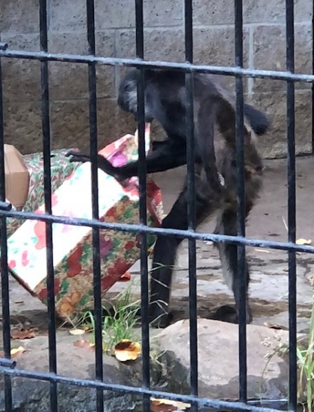 The meerkats received a holiday gift box with crickets crawling among colored plastic balls. Food was hidden for the anteater to sniff out. The spider monkey knocked to the ground gift boxes perched on swings in its cage, and then opened them to find food inside the box.