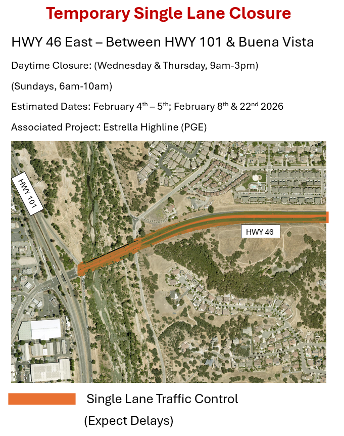 – Pacific Gas and Electric Co. will conduct temporary single-lane closures on Highway 46 East between Highway 101 and Buena Vista on multiple dates in February, according to an announcement.