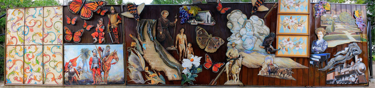 This part iron sculpture and part painting is a 20’ by 386’ iron wall with an artistic interpretation of how wine has grown to become a thriving industry throughout California. The second half of the wall is 20’ by 140’ wall of 4’ by 8’ photos from the early days of Paso Robles and the History of Wine in California.