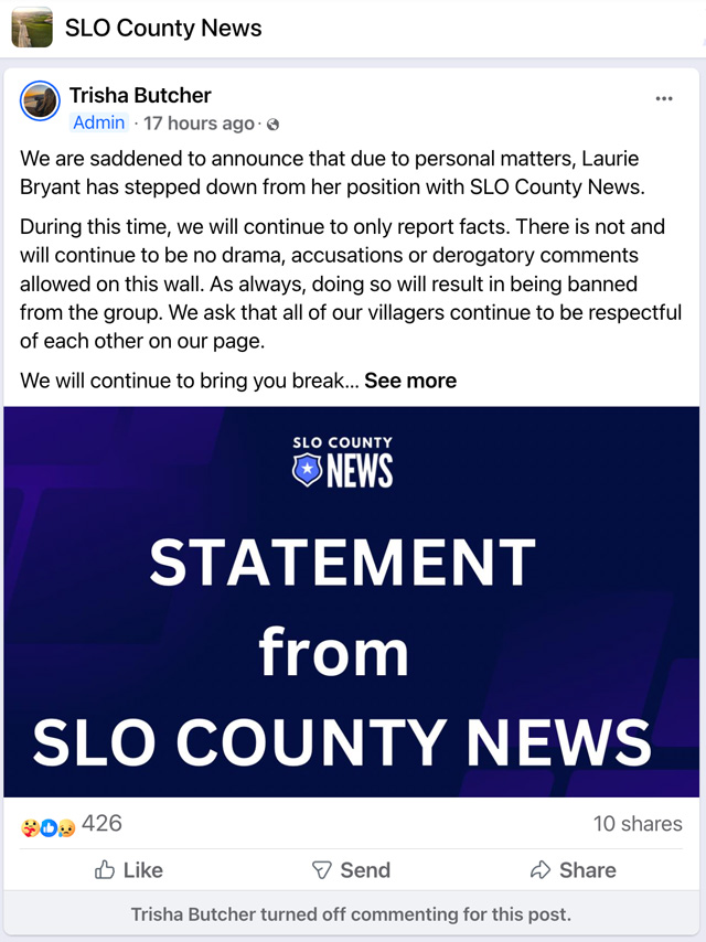 We are saddened to announce that due to personal matters, Laurie Bryant has stepped down from her position with SLO County News. During this time, we will continue to only report facts. There is not and will continue to be no drama, accusations or derogatory comments allowed on this wall. As always, doing so will result in being banned from the group. We ask that all of our villagers continue to be respectful of each other on our page. We will continue to bring you breaking news facts. We thank Laurie for years of service and dedication. And we will continue to maintain the original vision inspired by SLOstringer. – Trisha Butcher, admin of SLO County News