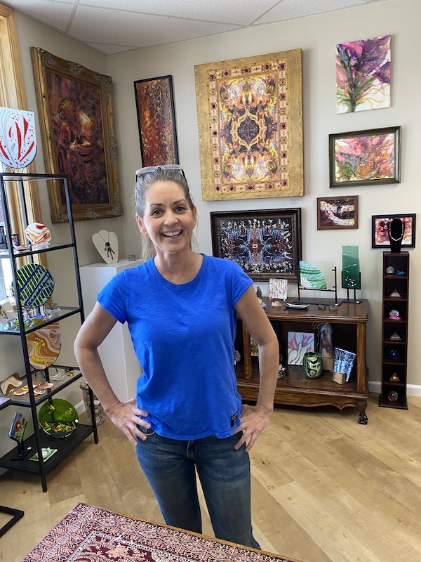 The gallery displays the work of five artists including stone jewelry by Carlotta Santa Cruz, glasswork and mobiles by Kelly Johnson, and rare wood designs by Rick Smucker.