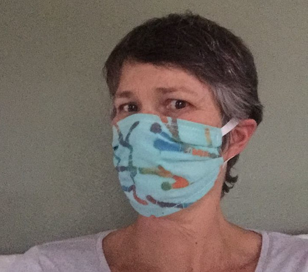 Local mask-maker, Colleen Leigh-Philippsen modeling one of her handmade masks.