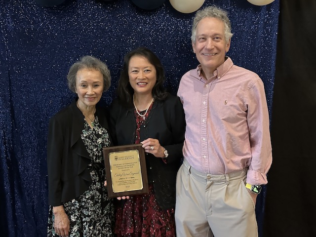 Sigmund accepting her 2023 Alumni of the Year award at CSU Fullerton with her mother, Wendy Woo, and husband, Stephen Sigmund, M.D. FACP.