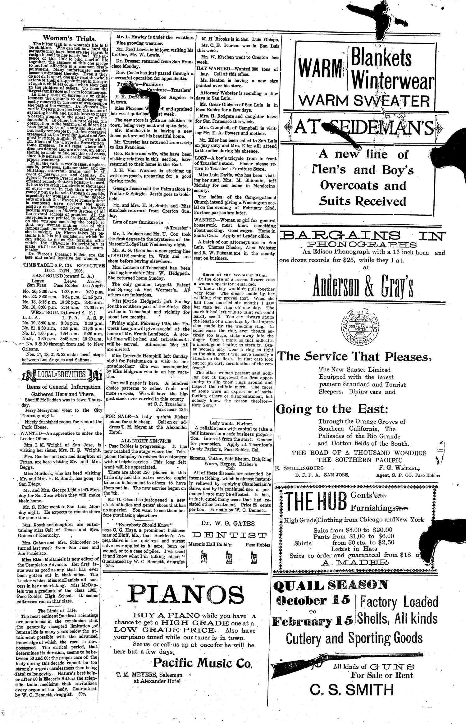 Paso Robles is progressing. It has now reached the stage where the Telephone Company furnishes its customers with all-night service. This long-felt want will be appreciated.