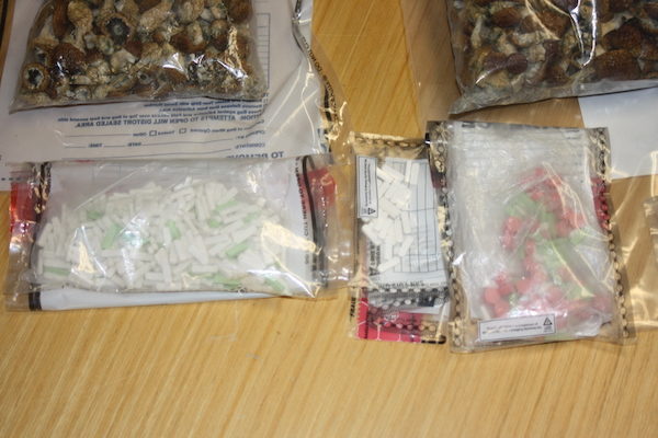 Investigators discovered at the residence approximately 2.4 ounces of MDMA (also known as Ecstasy), 5.7 ounces of Xanax, and 12.7 ounces of Psilocybin mushrooms. Estimated street value is approximately $6,000, according to police.
