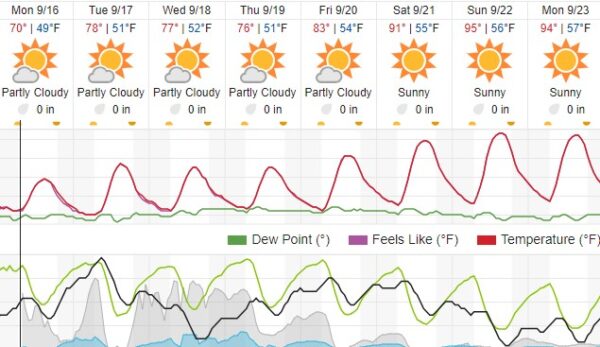 From Monday through Thursday, the skies will be partly cloudy. Overnight lows will range from the low to mid-50s throughout the week.