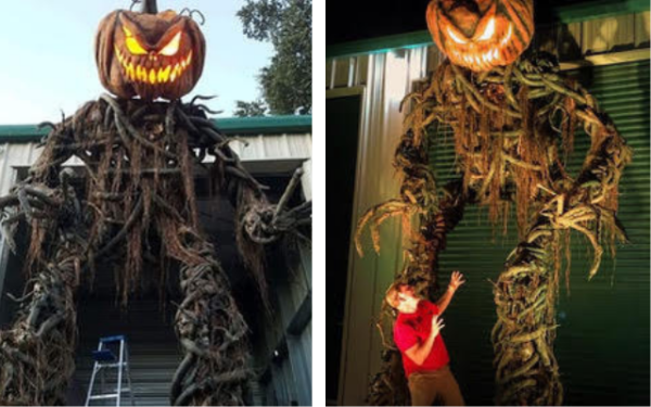 Golden pictured with a giant, 2-story scarecrow prop he built and sold to Winchester Mystery House where they had him on display during their Halloween tours.