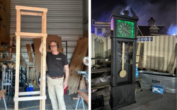 Golden in his shop with an in-progress shot of a large Grandfather Clock prop for Winchester Mystery House. Right: finished prop.
