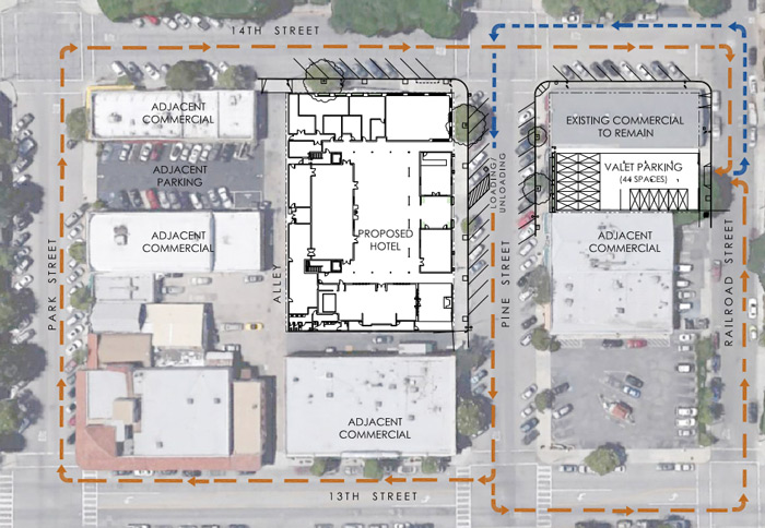 The southwest corner currently has three single-story commercial buildings, including the Village Thrift Store. These buildings are proposed to be removed and a new boutique hotel will be constructed on the site. The new hotel will be four stories in height and will contain a banquet room and restaurant in addition to the hotel guest rooms.