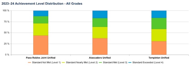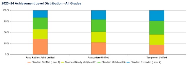 The Paso Robles Joint Unified School District (PRJUSD), Atascadero Unified School District (AUSD), and Templeton Unified School District (TUSD) all have reported lower test scores than those seen in the 2018-2019 school year. For the 2023-2024 school year, AUSD and TUSD both had a higher percentage of students that met or exceeded standards in ELA and mathematics compared to the average California state scores.