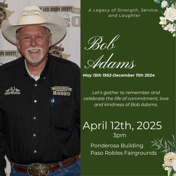 – Family, friends, and community members will gather on April 12 at 3 p.m. at the Ponderosa Building at the Paso Robles Fairgrounds to remember and celebrate the life of Bob Adams.