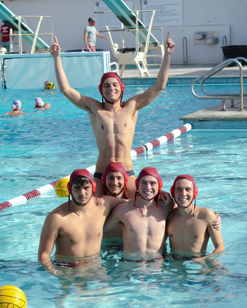 PRHS senior water polo players seniors, from left, Tre Eade, Zach Summers, Nolan Rumph, Wyatt Millsap, with Cole Eberhard at top.
