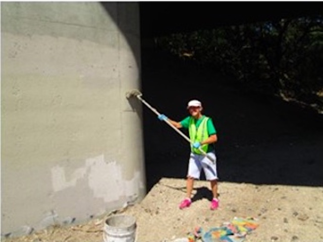 Volunteer Carolyn Carter cleaning graffiti in Paso Robles.