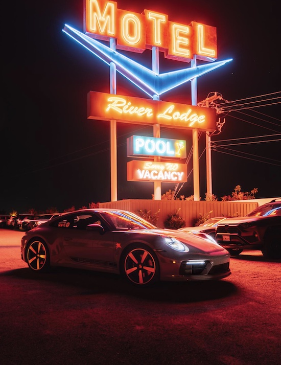 The lineup of vehicles included vintage Alfa Romeos, air-cooled Porsches, and an orange Volvo 245 wagon equipped with a Corvette LS engine. High-end exotics, restomods, Japanese classics, and cruisers also participated, with the River Lodge, a midcentury motel turned retro resort, serving as rally headquarters.
