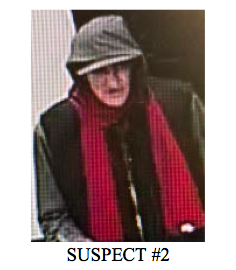 The suspects are both described as white males in their 20’s (see photos). Suspect #1 was wearing a black hooded sweatshirt, dark colored pants and a red baseball cap. Suspect #2 was wearing a dark colored hooded coat, dark colored pants and a red scarf.