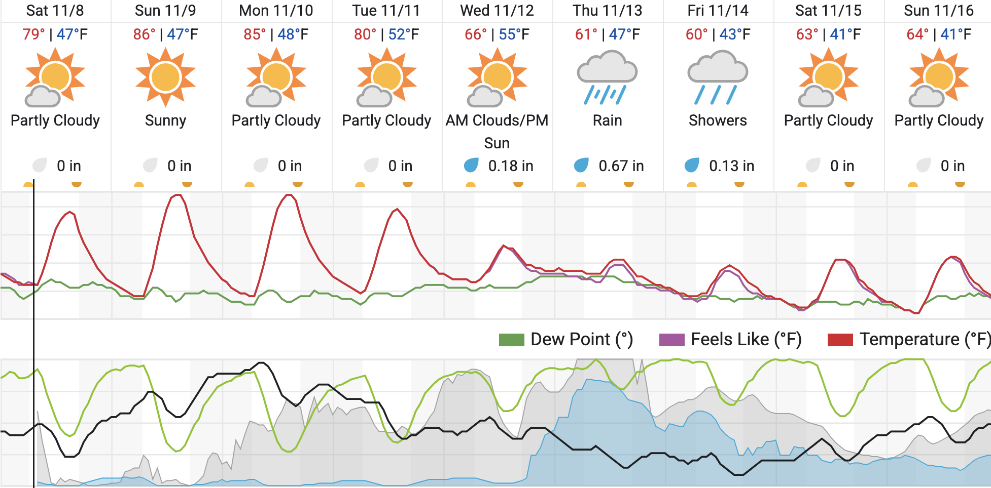 Saturday is expected to be partly cloudy, with a high near 79 degrees and an overnight low around 47. Sunday will be sunny and warmer, reaching a high of about 86 degrees with a low near 47. On Monday, skies will remain partly cloudy with a high around 85 and a low near 48. Tuesday will bring similar conditions, partly cloudy with a high near 80 and a low around 52.