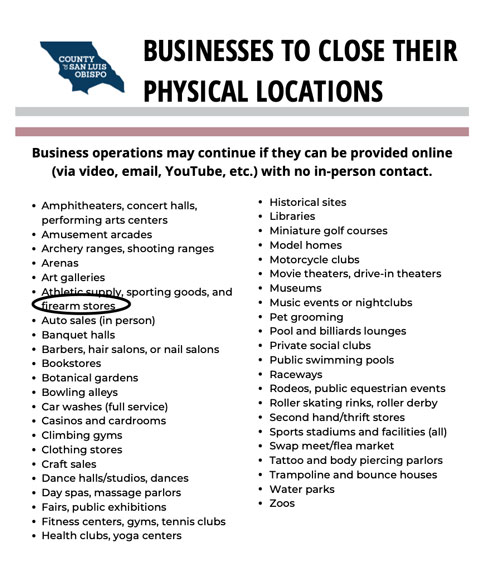–On Sunday at 3:30 p.m., San Luis Obispo County Emergency Services Director Wade Horton announced that he had consulted with the San Luis Obispo County Sheriff, and determined that firearm shops may remain open, though the shops had originally been specifically listed among businesses to close their physical locations.