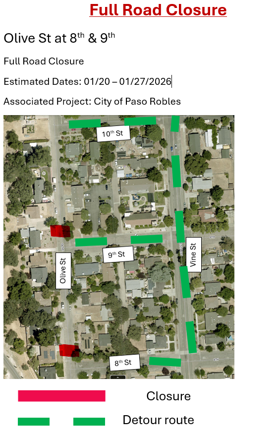 – A full road closure will affect Olive Street between 8th Street and 9th Street from Jan. 20 through Jan. 27 as part of a project associated with the City of Paso Robles.