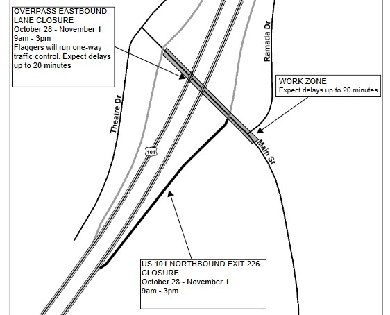 Improvements will include upgrades to signage and road striping. US 101 Exit 226 will be intermittently closed during work hours, with flaggers managing traffic control on the Main Street overpass.