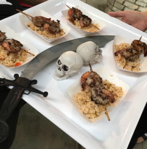 Created by Broken Earth winery’s Chris Cameron, the Cut-Throat Jerk Shrimp skewers served on a bed of confetti rice arrived on a tray dramatically decorated with skulls and a dagger.