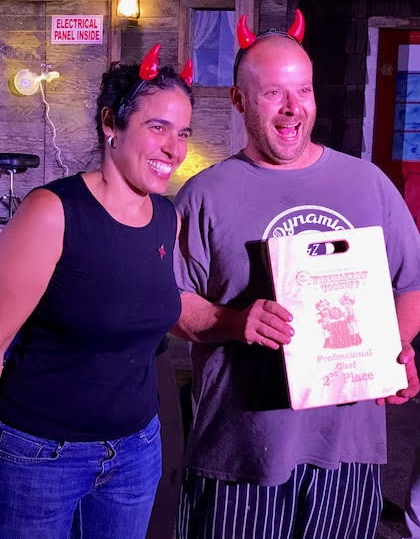 Offering colorful Mardi Gras beads to the judges, Gary and Marcy Eberle presented their famous gumbo creation of Laissez Lez Bons Temps Rouler (let the good times roll). “It’s my gringo gumbo recipe,” Gary admitted as he passed out mini bottles of tabasco for the judges to spike up the dish that combined slow smoked chicken and grilled Andouille sausage with roasted okra. “I made the roux myself,” Gary added with great pride.