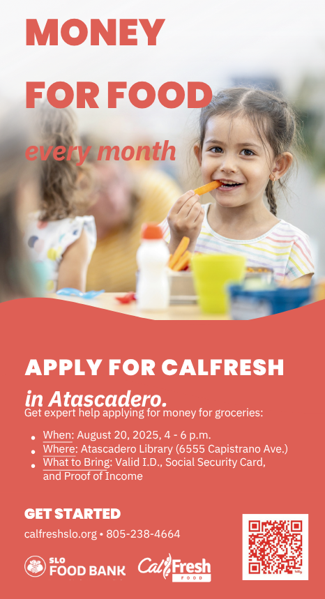 – The SLO Food Bank is partnering with the Department of Social Services (DSS) to host a CalFresh Application Assistance Event at the Atascadero Library on Wednesday, Aug. 20, from 4 to 6 p.m. No appointment is needed—this event is free and open to the public.