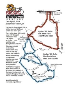 The 2018 SLOBC Wildflower Century bike ride is scheduled for Apr. 7, 2018, in the Creston/Shandon/Parkhill/Pozo area. About 1000 bicycle riders will be on local roads starting at 7 a.m. and finishing by 5 p.m., when the course closes. These are mostly experienced riders who we expect to ride safely, observe traffic laws, share the road, and respect local residents.