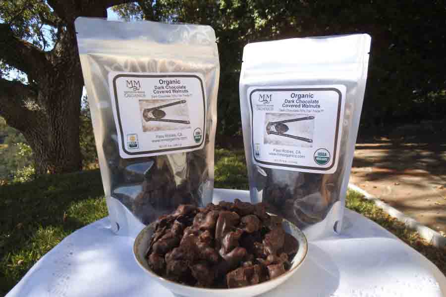 Manzanita Manor Orchard fair trade dark chocolate walnuts are crafted by local artisan chocolatier, Mama Ganache Artisan Chocolates of SLO, using walnuts from Manzanita Manor Organics and 70% dark Fair Trade organic chocolate.