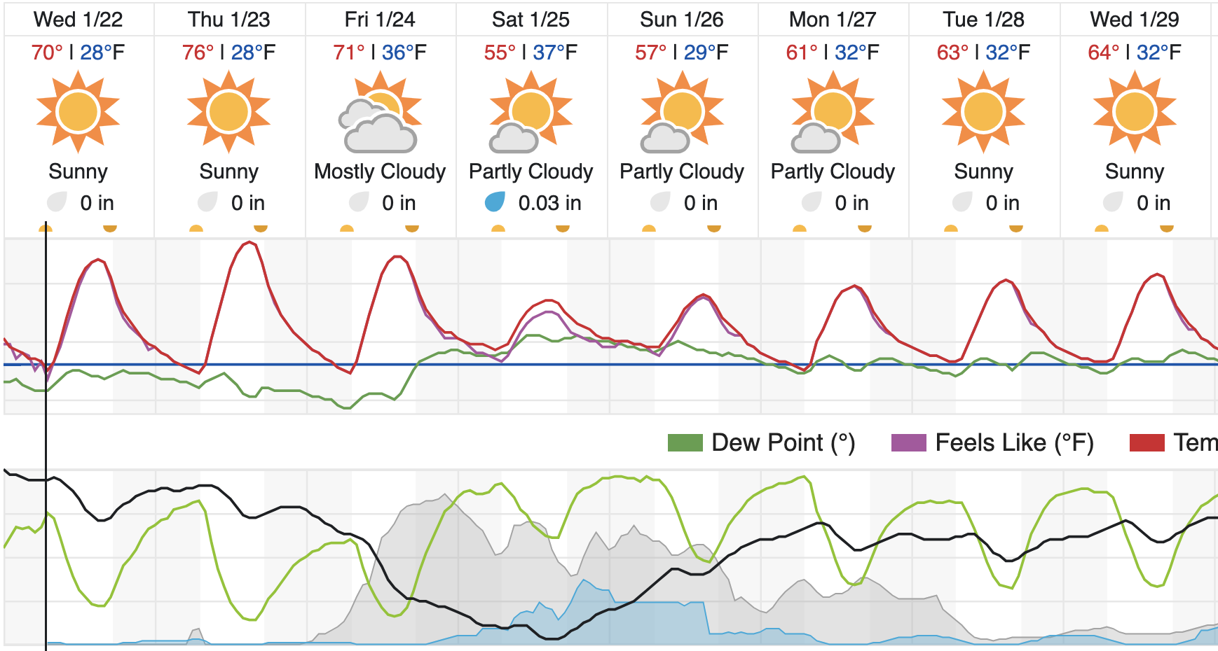 Sunny skies are in the forecast on Wednesday and Thursday, with highs of 70 and 76 degrees, respectively, and lows of 28 degrees both nights. Clouds move in on Friday, bringing mostly cloudy skies with a high of 71 and a low of 36. By Saturday, temperatures will cool significantly, with a high of 55 and a low of 37, and a slight chance of rain amounting to about 0.03 inches.
