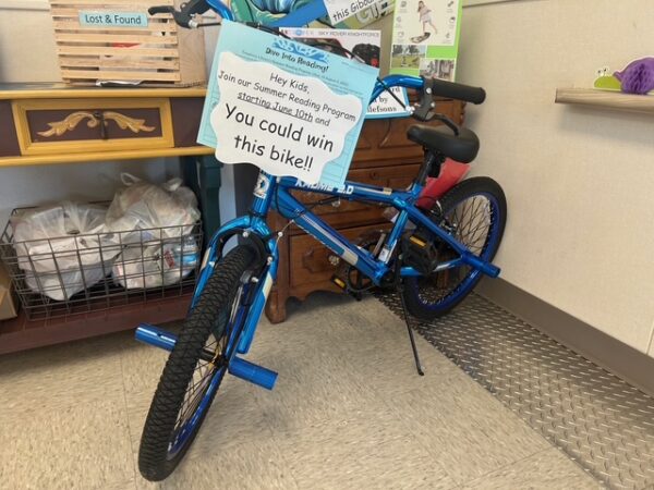 Prizes will be awarded for every 80 minutes spent reading or being read to. Tickets for a grand prize drawing on Aug. 8 at 2 p.m. will also be given for each completed segment. Two bikes and a GiBoard donated by Janice and Steve Tollefson will be given away along with other prizes.